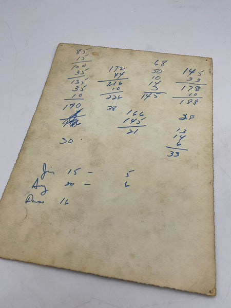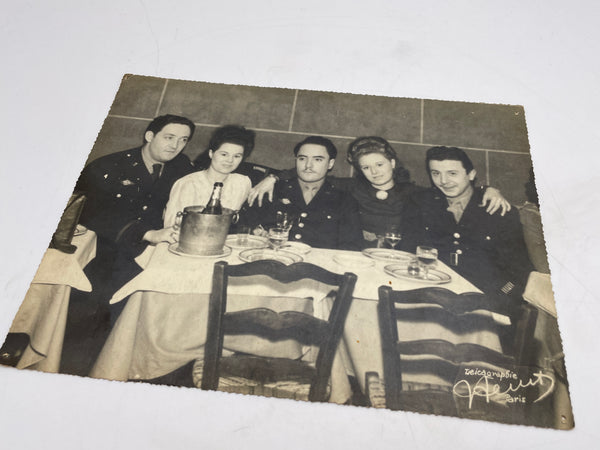 A very interesting shot, good size at 6 1/2 by 9 inches. Shows three GI Officers with two, presumably French, girls. Note the Champagne bottle on the table. Rear looks to have some scores, possibly from a card game tallied up?