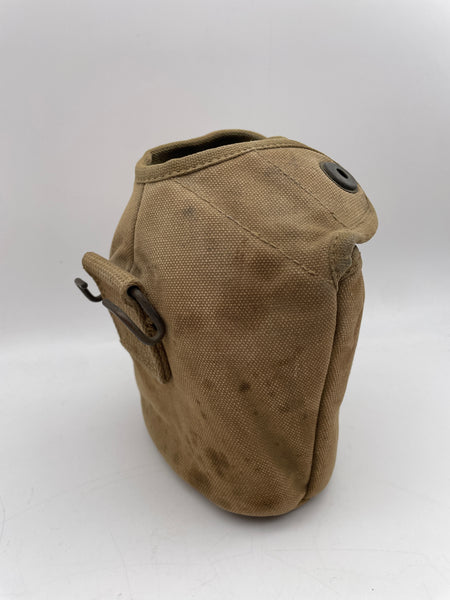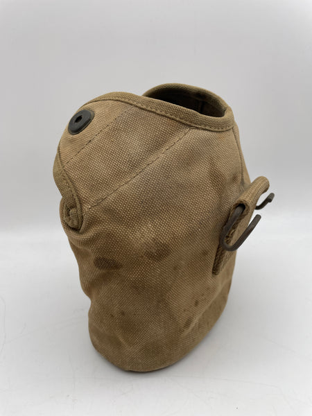 An original canteen cover, good usable condition, hanging loop on the rear with bar still functional. Date marked 1942. Maker A G Corp.