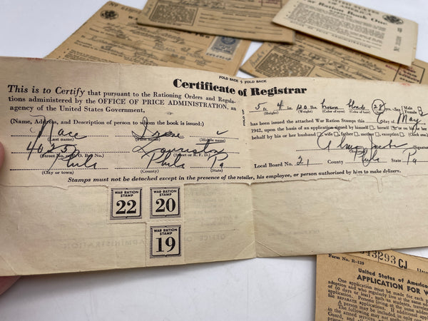 Seems to be a single families WW2 era ration books, belonging to Irene and Charles Nace of Lauriston Street, Philadelphia. Some of the books retain a good number of the coupons. Also within the group is a "Sugar Purchase Certificate" and applications for ration books.