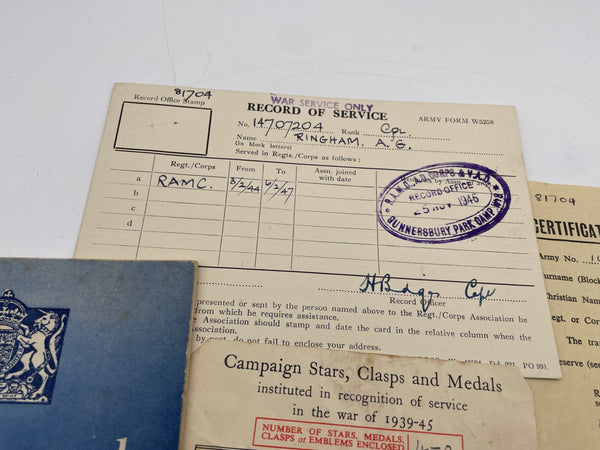An interesting group, comprising the Record of Service for Cpl. A. G. Ringham (14707204), his Certificate of Transfer to the Army Reserve, his Medal Transmission slip and a booklet that he would have been handed as he demobbed, entitled "Release and Resettlement".