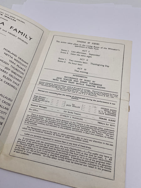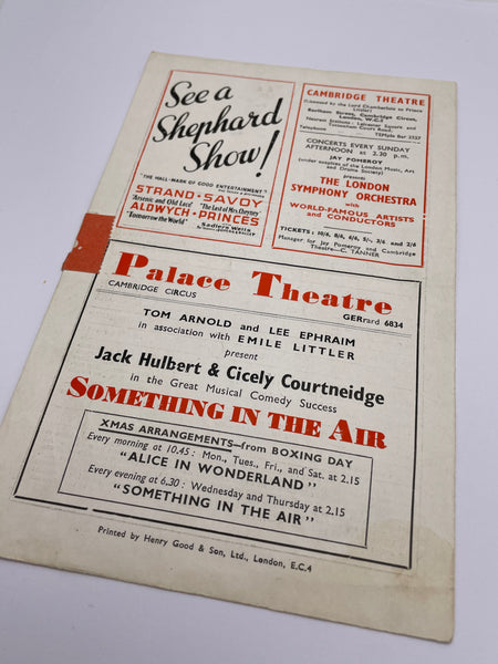 An interesting Home Front piece, four pages, entirely original, being a programme for "Three's A Crowd" at the Saville Theatre on Shaftesbury Avenue. Undated but does reference air raid warnings during the production. Research suggests the play opened at The Saville on 21 September 1944 and closed just after VE Day on 12 May 1945.